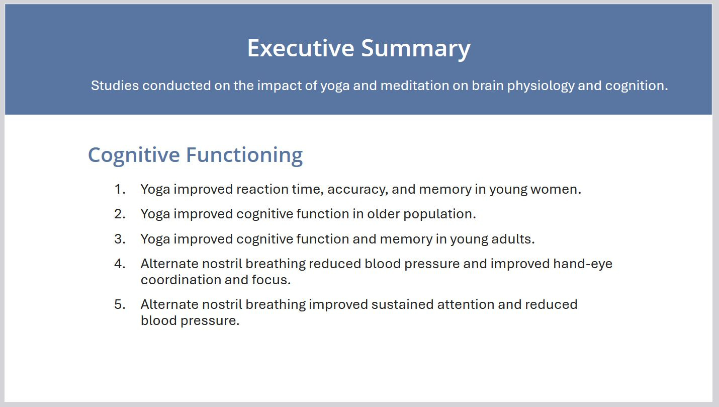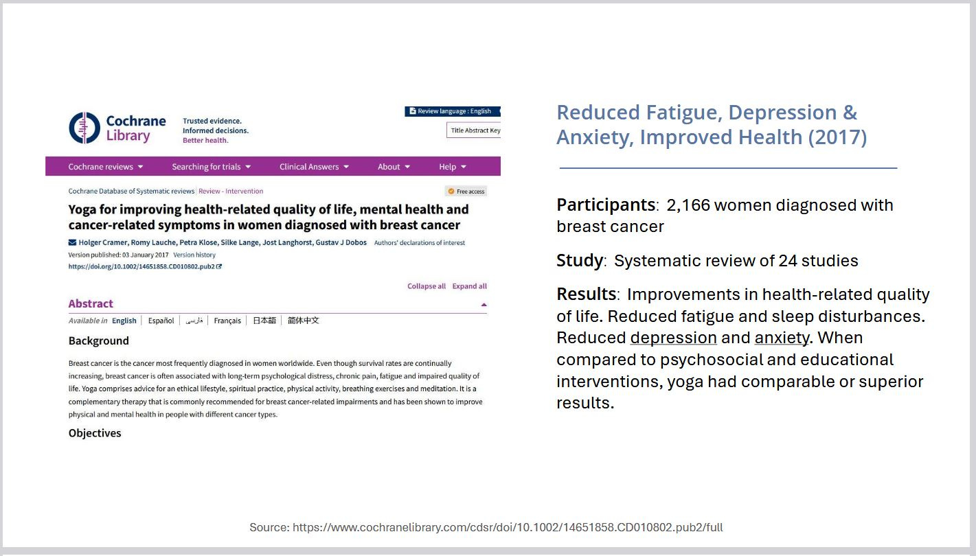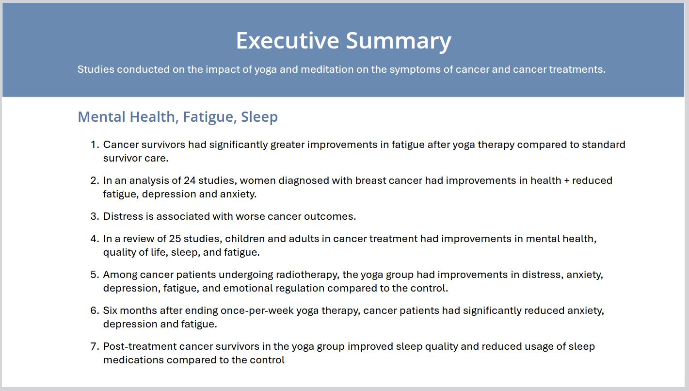You might assume this kind of research would already be easy to find, share, and use. I remember thinking it must be. But each time I followed promising links, I came up empty-handed — unable to find clear and contextualized research, organized as needed and with lecture-ready resources that educators and providers actually need. So I made it a priority to curate, organize, contextualize, summarize, and carefully link the research. We’re now up to 262 research studies on the impact of yoga, instantly accessible, verifiable, and shareable.